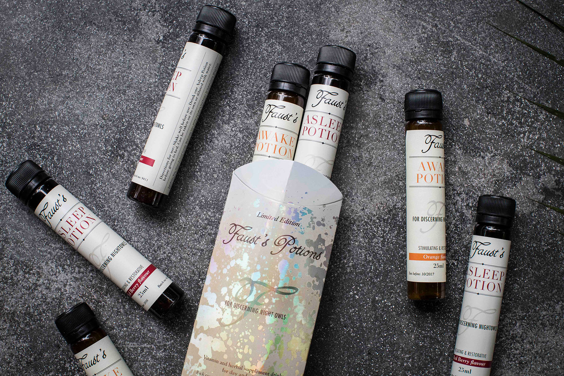 Faust’s Potions creates natural drinks to counteract the effects of a busy lifestyle, such as fatigue, jet lag, and hangovers. Founded by Nina Faust with assistance from the University of Memphis Health & Sport Sciences Department and Vitrition UK labs, the brand features modern labels and packaging designed with a classic style.